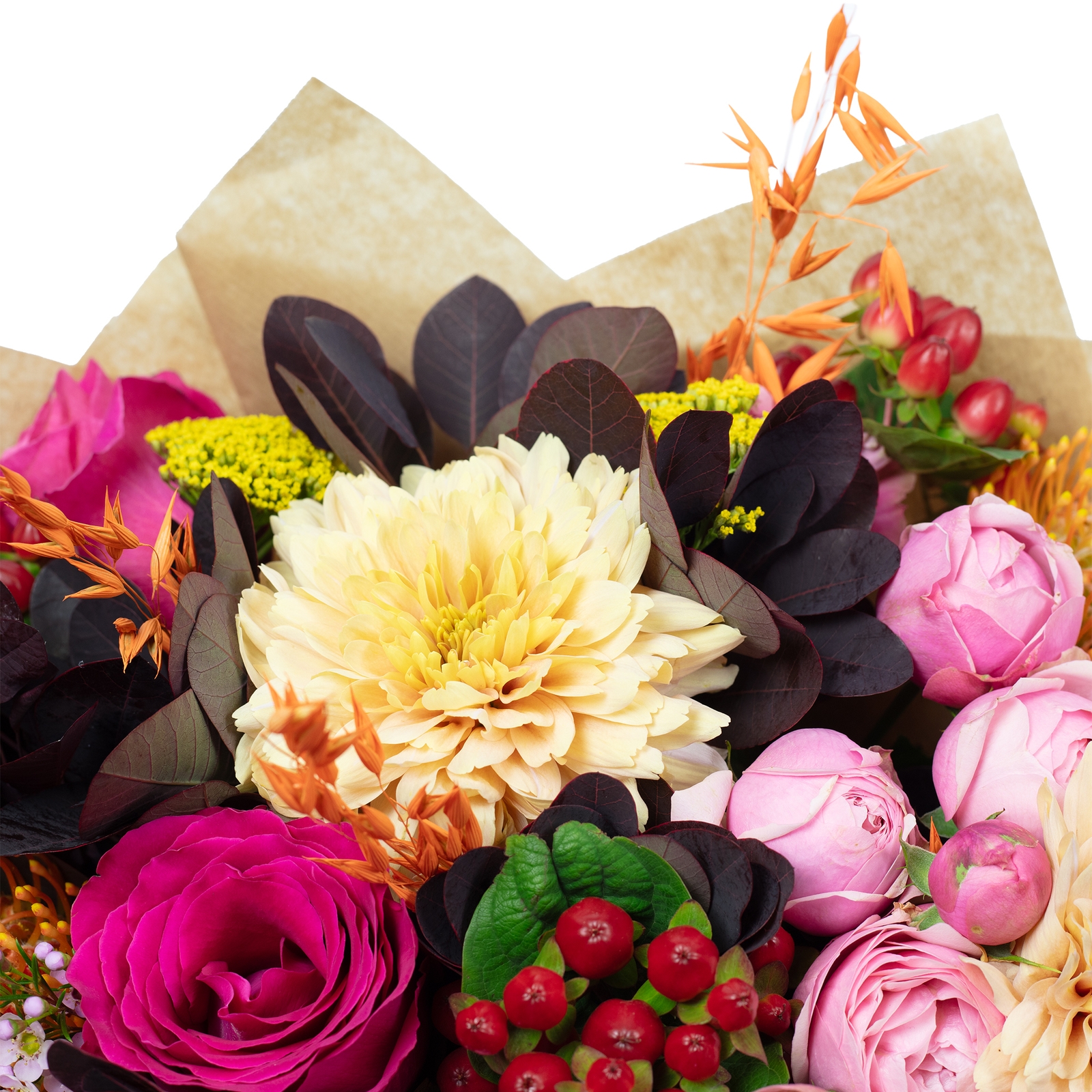 Strahlendes Pink, cremige Blüten, sonniges Gelb und leuchtendes Orange spielen hier perfekt zusammen. Dazu dunkle Blätter, die die Farben noch intensiver strahlen lassen, und feine Gräser, die dem Strauß eine lässige Note verleihen. Kleine Beeren setzen süße Akzente – fertig ist ein Look, der einfach gute Laune macht.
