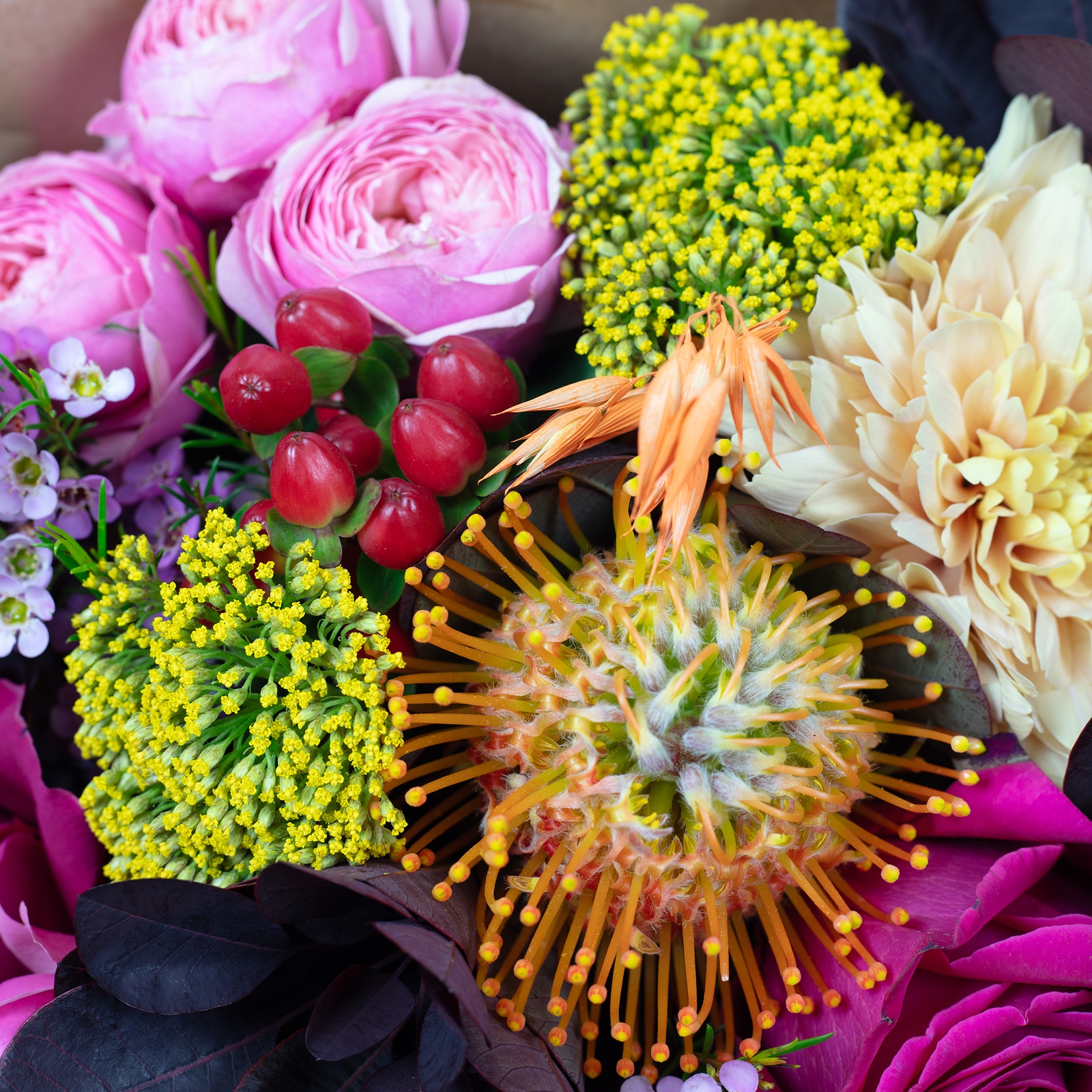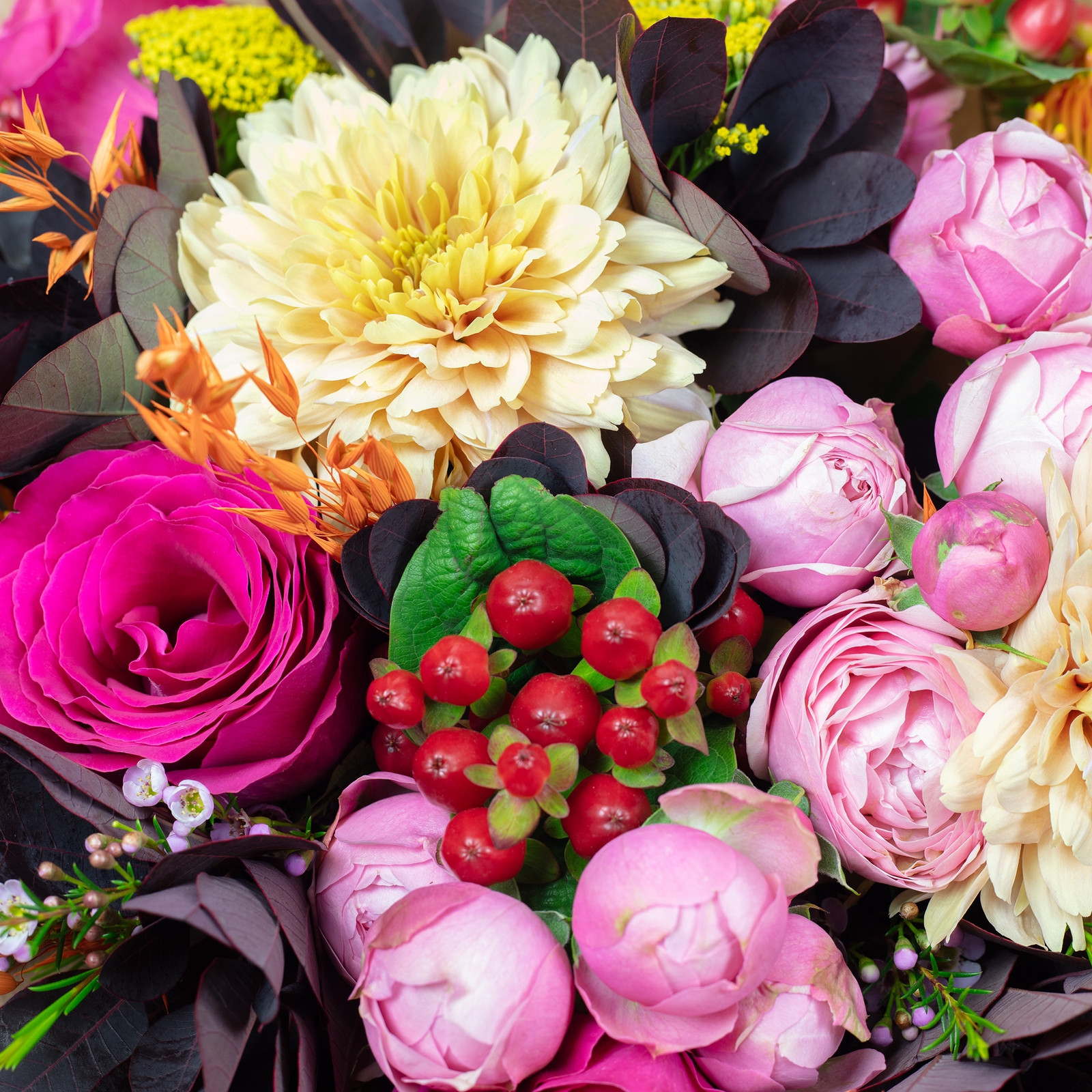 Strahlendes Pink, cremige Blüten, sonniges Gelb und leuchtendes Orange spielen hier perfekt zusammen. Dazu dunkle Blätter, die die Farben noch intensiver strahlen lassen, und feine Gräser, die dem Strauß eine lässige Note verleihen. Kleine Beeren setzen süße Akzente – fertig ist ein Look, der einfach gute Laune macht.
