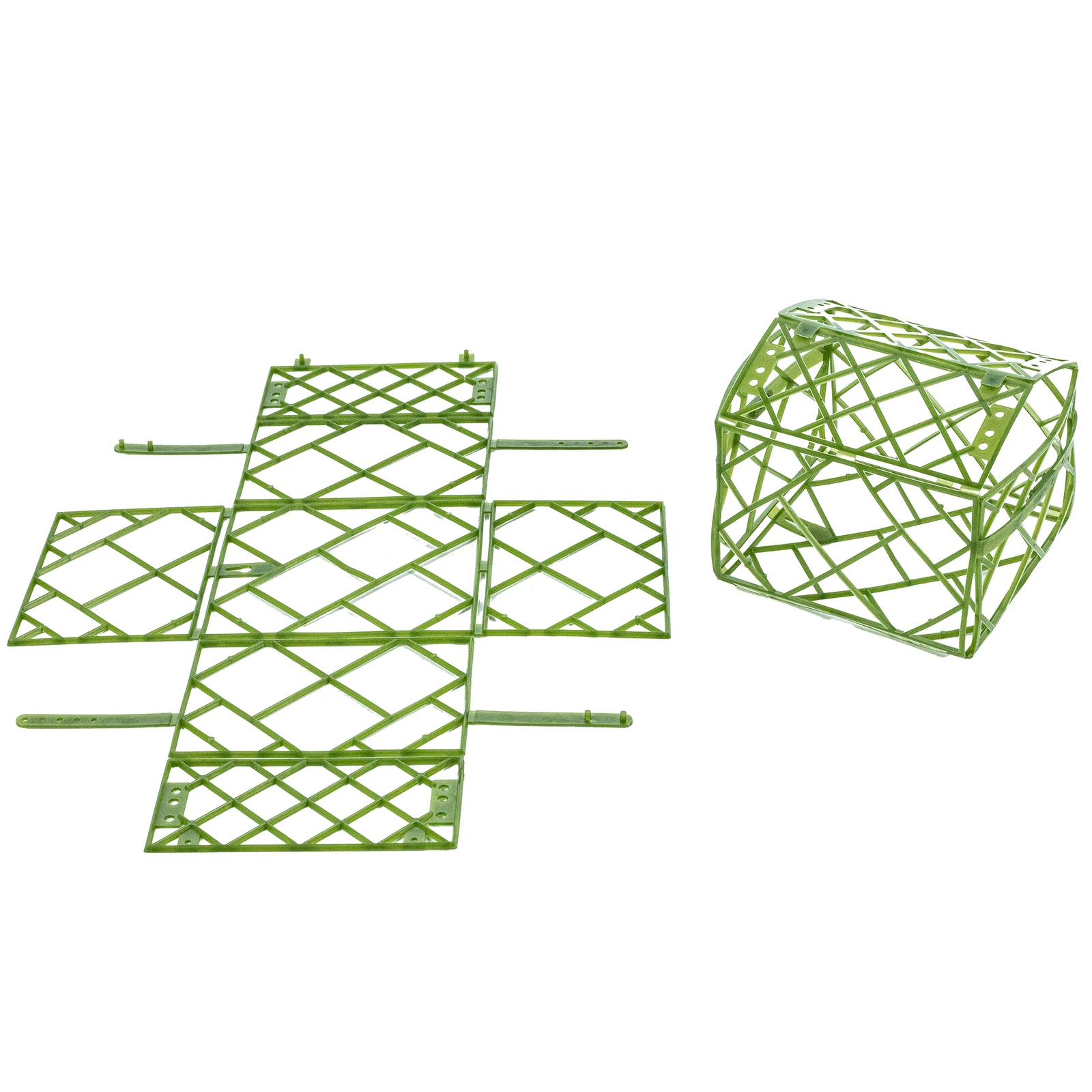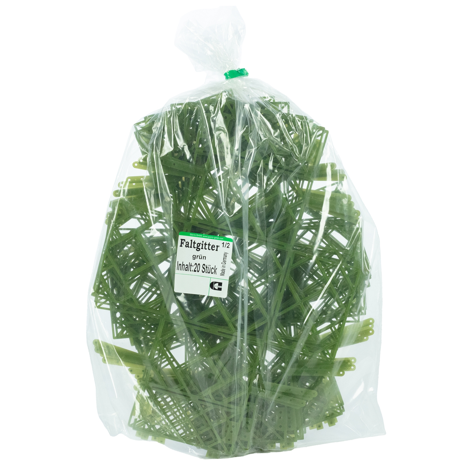 Universelles Faltgitter aus recycelbarem Polyethylen. Sie können den Gitterkorb zum Befüllen mit Steckschaum verwenden. Ein halber Ziegel passt in den Korb. Jedes Faltgitter hat eine Breite von ca. 11,5 cm, eine Höhe von ca. 8 cm und eine Länge von ca. 11,5 cm. Eine Packung enthält 20 Faltgitter.