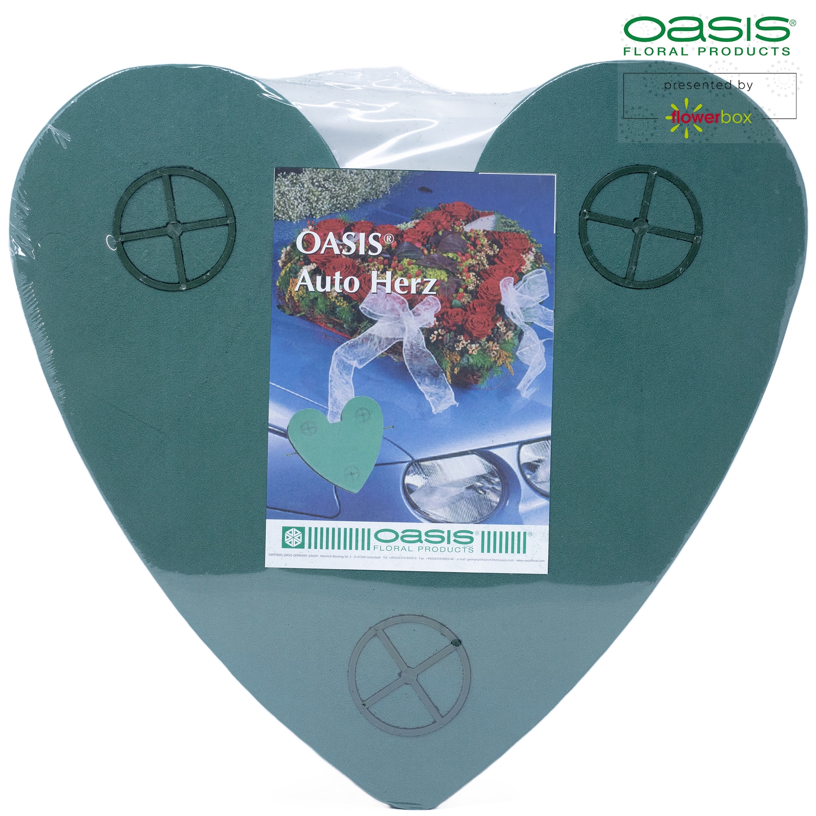 Ideal für die Hochzeitsfloristik. Die Blumendekoration kann bereits am Vortag fertig gestellt und dann, zur richtigen Zeit, in Sekundenschnelle auf der gewünschten Unterlage (z. B. Motorhaube) befestigt werden.TIPP: Art. Nr. 11-03071 wird mit zwei OASIS® Steckschaum-Ersatzherzen geliefert und vereint somit höchste Qualität und Wirtschaftlichkeit.Nachdem das OASIS® Auto Herz besteckt, gesäubertund getrocknet ist, sind die Saugfläche des Vakuumsaugers und die dafür vorgesehene Unterlage zu befestigen. Die Unterlage muss sauber, trocken und fettfrei sein, da ansonsten die Haltekraft des Vakuumsaugers nicht gewährleistet ist. Auch ein frisch polierter Autolack kann die Haltekraft des Vakuumsaugers verringern. In diesem Fall sollte die Politur an der entsprechenden Stelle vorsichtig mit warmem Wasser, Spülmittel und einem fusselfreien Lappen (Ledertuch) entfernt werden. Das Herzmuss auf der Motorhaube platziert und der Vakuumsaugerdurch gleichzeitiges nach außen ziehen der beiden Zuggriffe aktiviertwerden. Indem die Zuggriffe des Vakuumsaugers gleichzeitig nach innen gedrückt werden, wird automatisch die Verbindung zur Unterlage wieder gelöst. Sollte der Sauger sich nicht sofort lösen, muss mit der Fingerkuppe die Saugfläche des Vakuumsaugers am Rand etwas angehoben werden, damit Luft in das noch bestehende Vakuum einströmen kann. So kann in jedem Fall das OASIS® Auto Herzabgehoben werden.