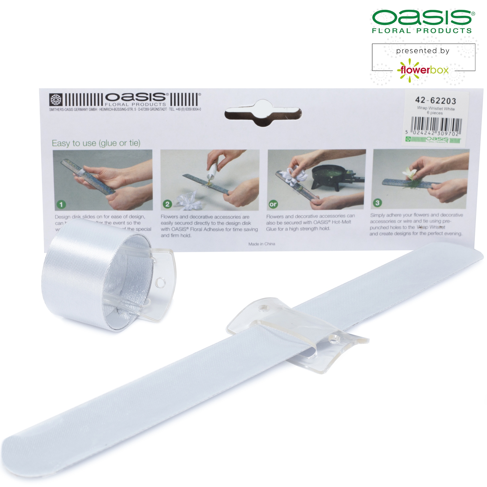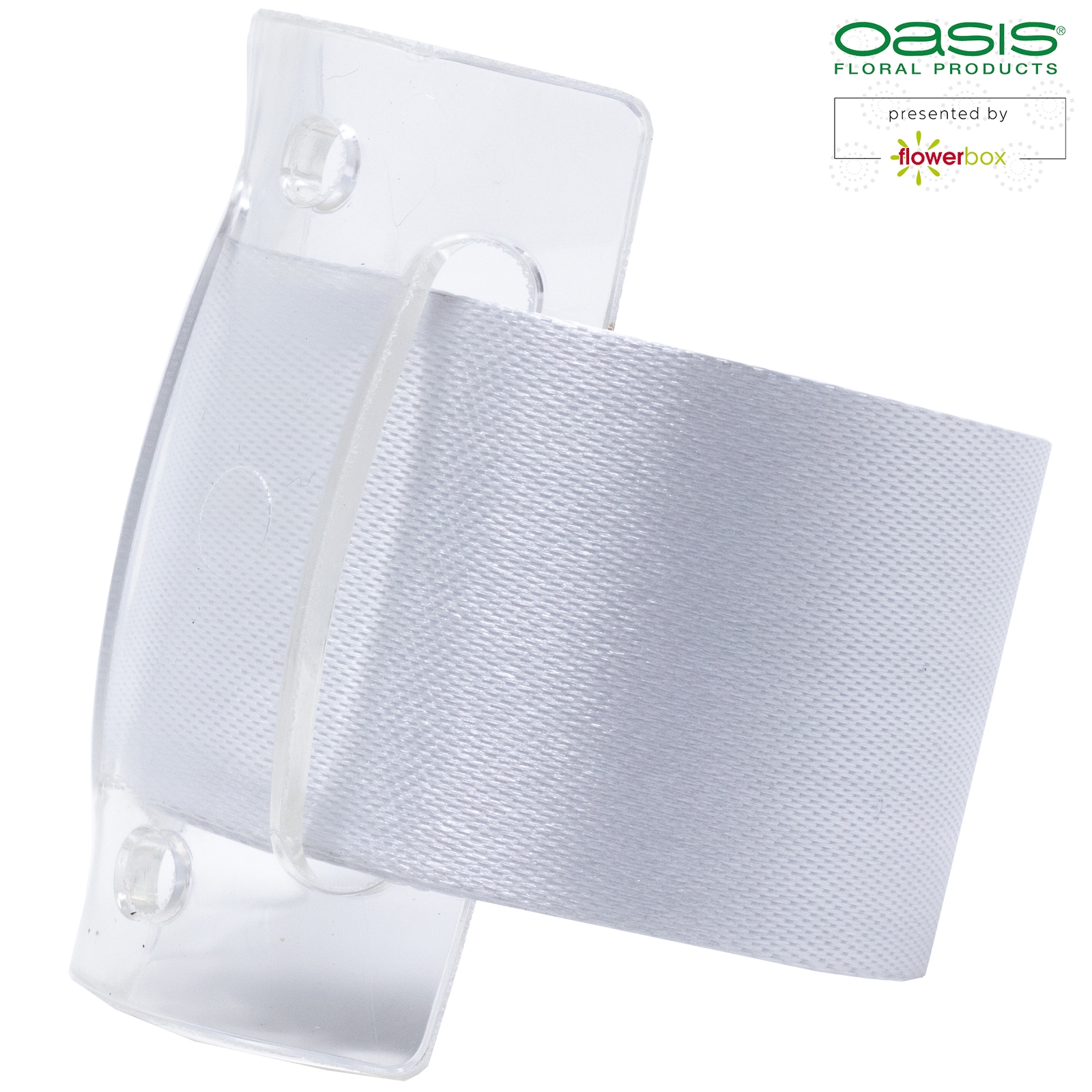 Das Armband eignet sich hervorragend für Schmuck am Handgelenk bei festlichen Events. Es hat eine Satinoberfläche, ist fest und rollt sich von selbst um das Handgelenk, sodass ein Verschluss nicht nötig ist. Mithilfe des transparenten Kunststoffträgers am Armband lässt sich floraler Schmuck problemlos befestigen.