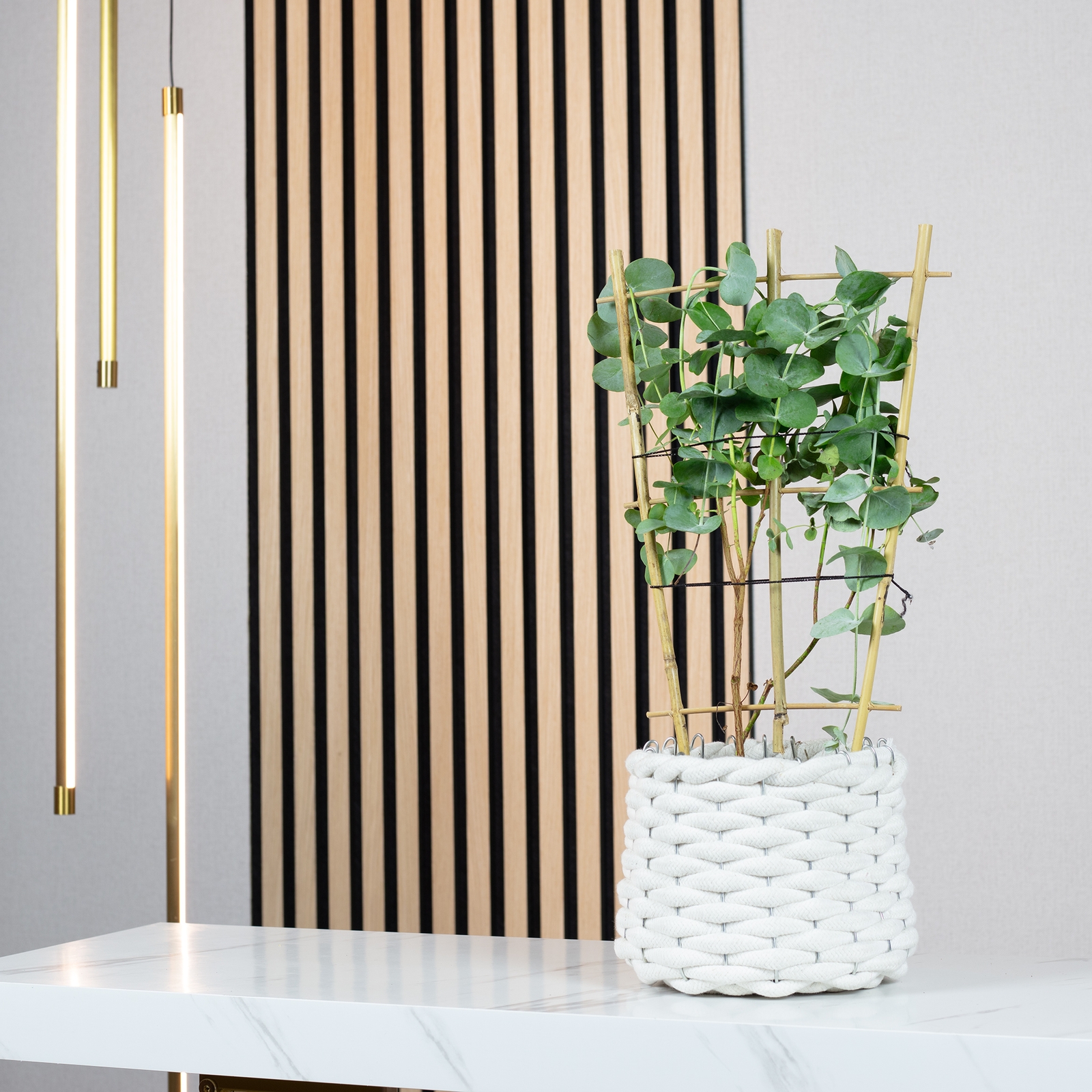 Die runden, aromatisch duftenden Blätter sehen nicht nur wunderschön aus – sie versprühen einen Hauch von Wellness und Natürlichkeit. Ob als lebende Zimmerpflanze oder als frischer Zweig in der Vase – Eukalyptus ist ein echtes Multitalent und ein beliebter Favorit für moderne Dekorationen.