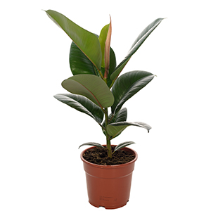 Ficus elastica, auch bekannt unter seinem deutschen Namen Gummibaum, zählt zu den Maulbeergewächsen und stammt ursprünglich aus Indien und Indonesien. Dort wird der Gummibaum bis zu 25 Meter hoch. Hierzulande war er besonders in den 1980ern eine beliebte Zimmerpflanze. Seit einigen Jahren erlebt sie wieder ein Comeback. Bei der Sorte "Robusta" handelt es sich um eine sehr pflegeleichte und robuste Art, die sich mit ihren ledrigen, kräftig grünen Blättern als Solitärpflanze in Büro oder Wohnzimmer besonders gut macht.