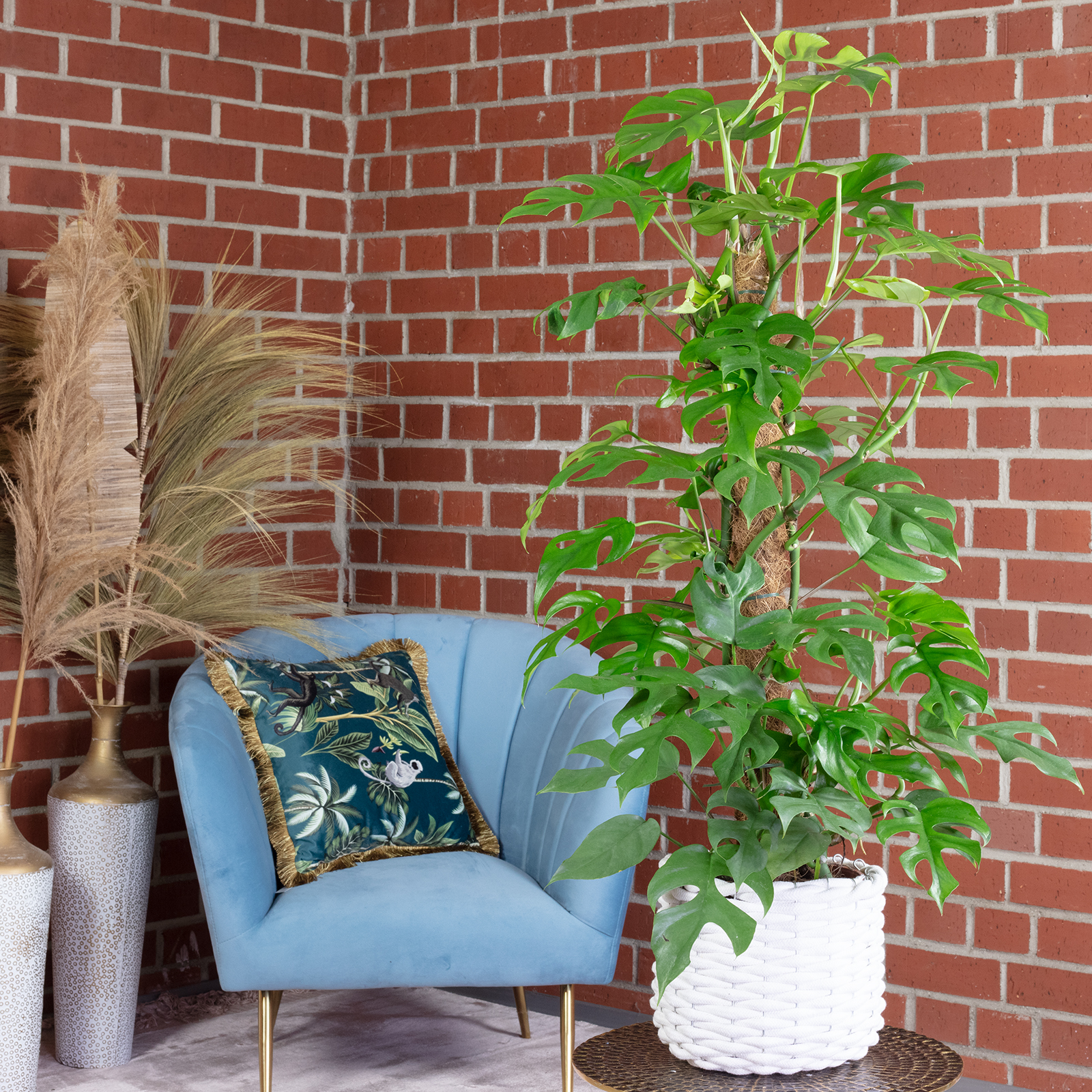 Die Monstera Minima stammt ursprünglich aus den Wäldern Mittel- und Südamerikas und hat sich dort durch die spezifische Blattform an die Lichtverhältnisse angepasst. Sie trägt dunkel- bis mittelgrüne, glänzende Blätter, wobei die bei wenig Licht gebildeten Blätter wenig und nicht tief eingeschnitten sind, während unter relativ viel Licht gebildete Blätter starke und zahlreiche Blatteinschneidungen besitzen. Das Fensterblatt benötigt aufgrund seiner Herkunft nur mäßig Wasser und fühlt sich an einem hellen und warmen Standort ohne direkte Sonneneinstrahlung am wohlsten, der der beliebten Trendpflanze den nötigen Platz bietet, ihre vollkommene Schönheit zu entfalten. Die Monstera gedeiht bei Zimmertemperatur (nicht dauerhaft unter ca. 20 °C!) sehr gut und kann bei guter Pflege auch in Zimmerkultur zur Blüte kommen. Am Moosstab ist das Fensterblatt ein ganz besonderer Hingucker. Die Monstera minima gehört zu den kleinsten ihrer Art, wenn man die Blattgrößen betrachtet.