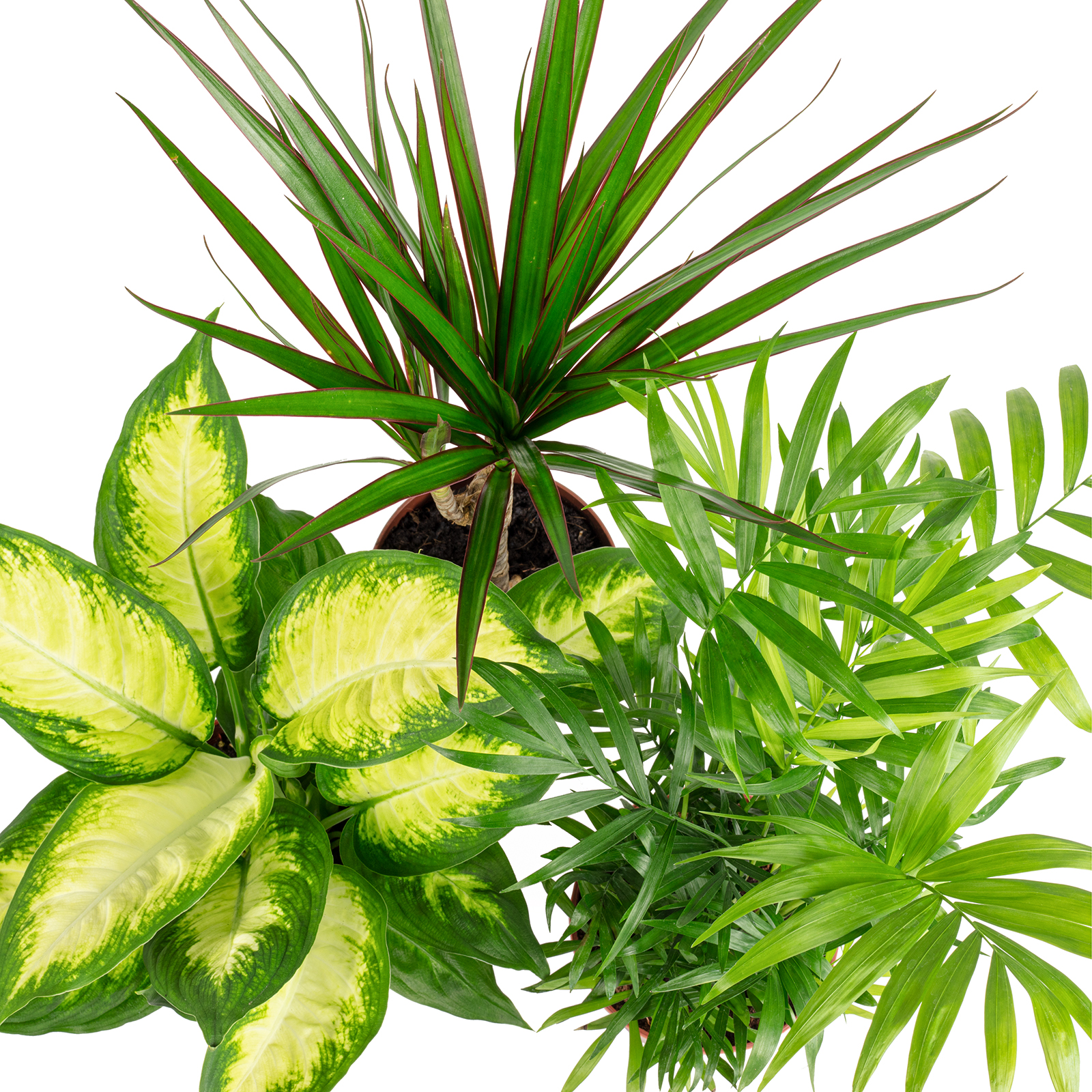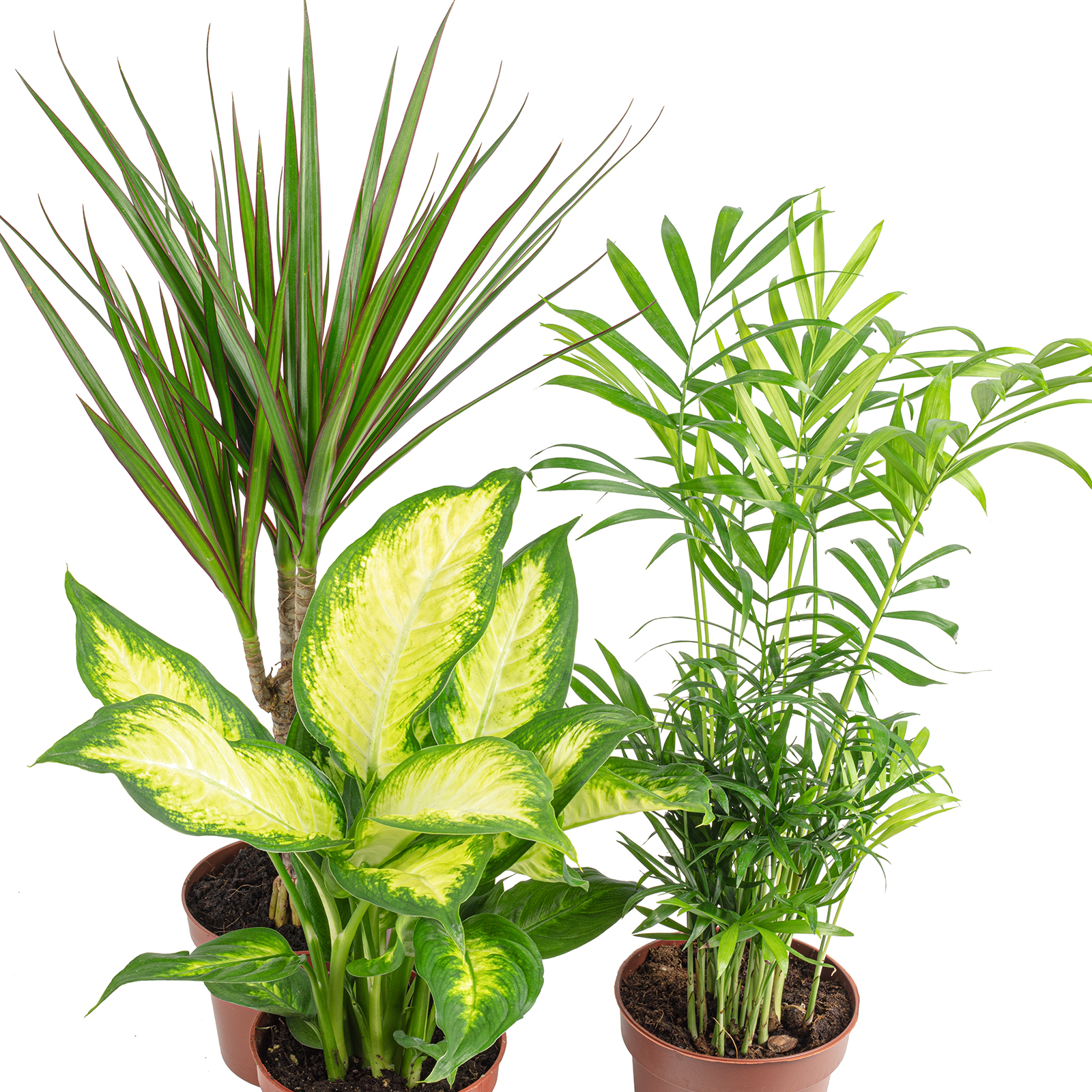 Tropisches Pflanzenset - 3 pflegeleichte Grünpflanzen in einem Set - Bergpalme, Dieffenbachie, Drachenbaum - ca. 30 cm hoch