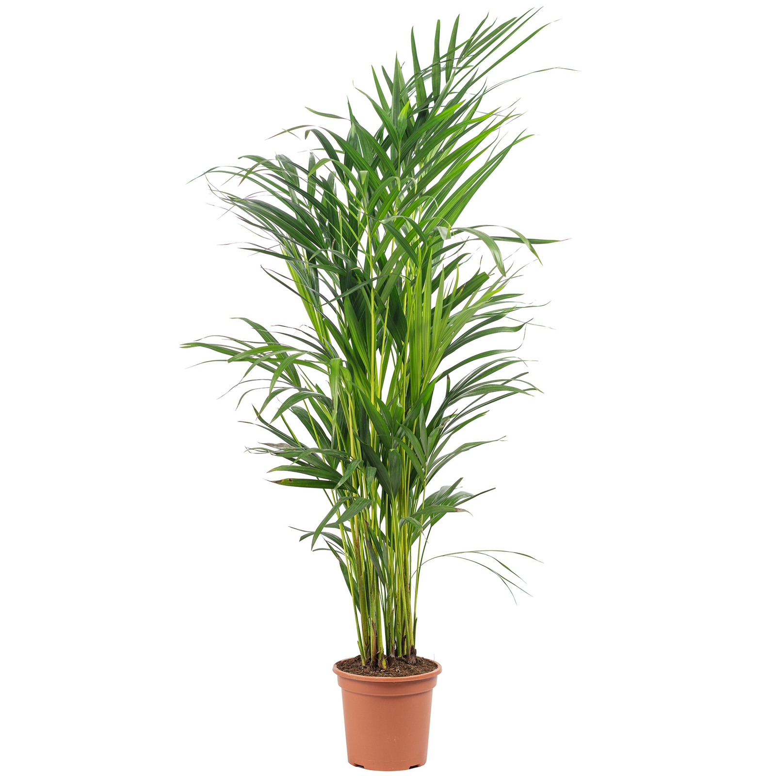 Die immergrüne Goldfruchtpalme, die auch Arecapalme genannt wird, bringt als tropische Zimmerpflanze ganzjährig Urlaubsfeeling in Ihr Zuhause. Zudem verbessert sie aufgrund ihrer luftreinigenden Eigenschaften das Raumklima. Sie besticht durch ihren opulenten, schirmförmigen Schopf mit ausladend überhängenden Wedeln. Da Arecapalme in den feuchten Tropen Madagaskars beheimatet ist, sollte der Boden stets feucht gehalten werden, ohne dass sie mit ihren Wurzeln im Wasser steht. Sie bevorzugt einen hellen Standort, verträgt jedoch keine direkte Sonneneinstrahlung.
