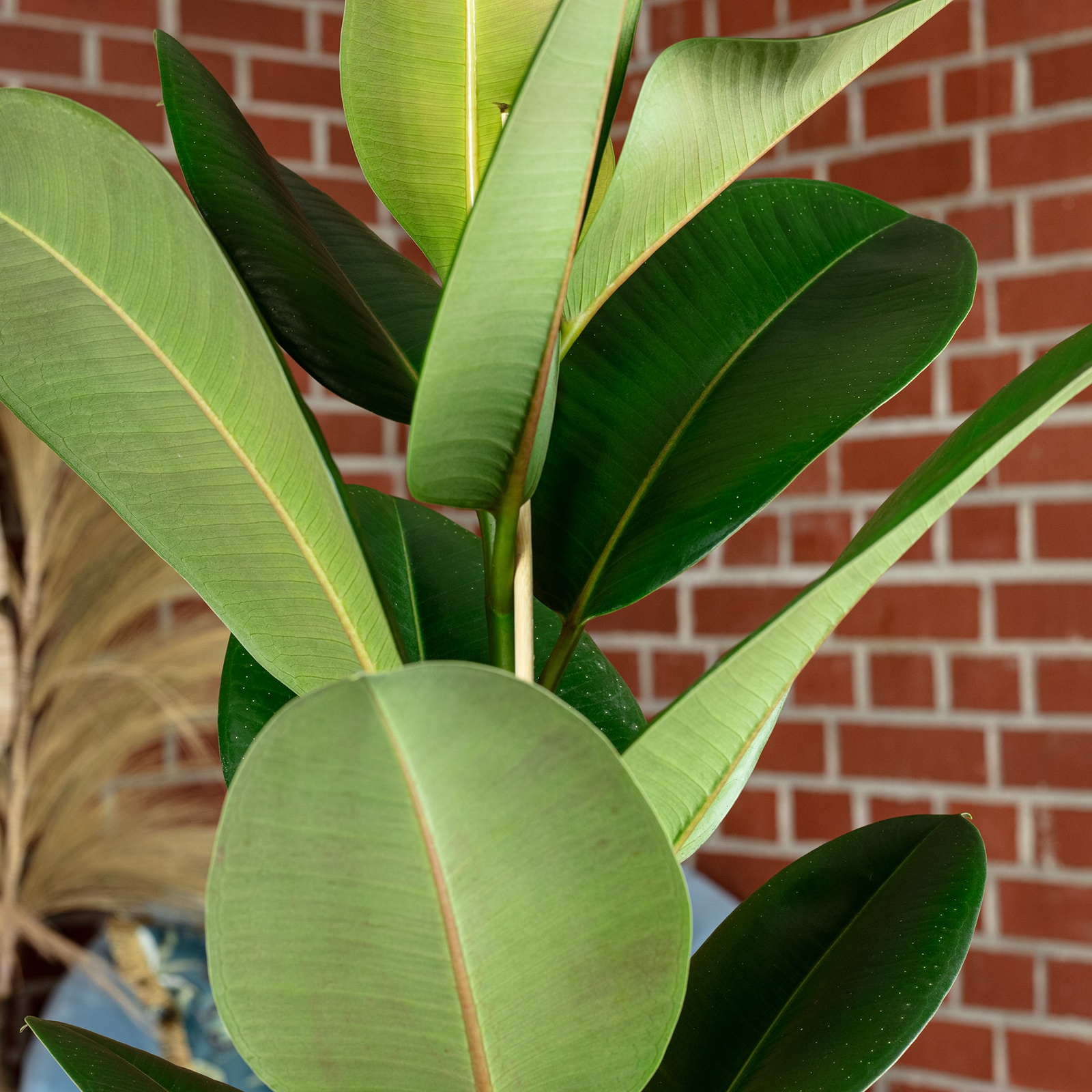 Ficus elastica, auch bekannt unter seinem deutschen Namen Gummibaum, zählt zu den Maulbeergewächsen und stammt ursprünglich aus Indien und Indonesien. Dort wird der Gummibaum bis zu 25 Meter hoch. Hierzulande war er besonders in den 1980ern eine beliebte Zimmerpflanze. Seit einigen Jahren erlebt sie wieder ein Comeback. Bei der Sorte "Robusta" handelt es sich um eine sehr pflegeleichte und robuste Art, die sich mit ihren ledrigen, kräftig grünen Blättern als Solitärpflanze in Büro oder Wohnzimmer besonders gut macht.